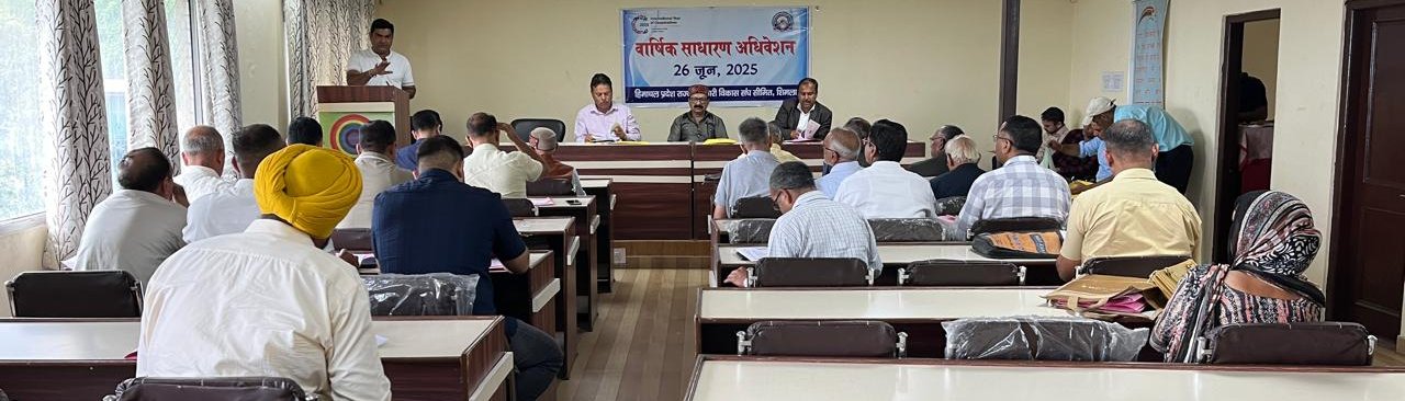 हि० प्र० राज्य सहकारी विकास संघ के साधारण अधिवेशन की कार्यवाही दिनांक 26.6.2025 को श्री संतोष कुमार शर्मा की अध्यक्षता में सफलतापूर्वक सम्पन्न हुई जिसमें 24 प्रतिनिधियों ने भाग लिया । इस बैठक में गत वर्ष की कार्यवाही की पुष्टि के साथ विकास संघ के अंकेक्षण करवाने, इस वर्ष की कार्ययोजना बारे व बजट, प्रशिक्षण केन्द्रों में डिप्लोमा कोर्स की अवधि बढ़ाने, व वर्ष के साधारण अधिवेशन की बैठक को Power Point Presentation के माध्यम से करवाने बारे जैसे सामयिक विषयों पर विस्तारपूर्वक चर्चा की गई।